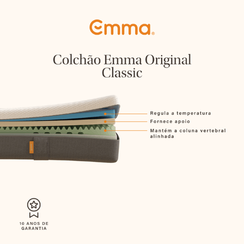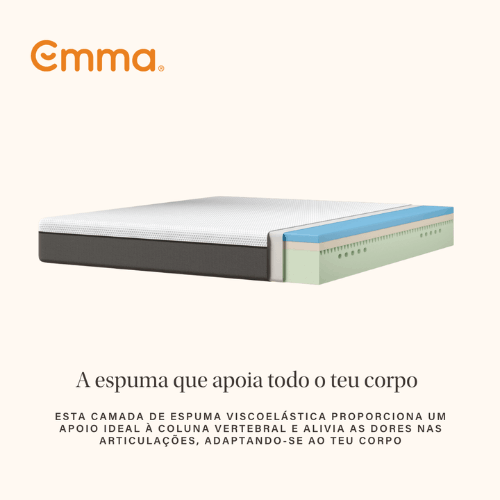 Este é um colchão composto 100% por espuma, distribuída por 3 camadas de espuma viscoelástica com funções distintas. O núcleo de espuma HR é a componente que fornece a firmeza e o suporte ao seu corpo, enquanto que as camadas de viscoelástico e Airgocell promovem uma excelente sensação de conforto e adaptam-se a todas as curvas do seu corpo por forma a proporcionar um descanso ergonómico e sustentado. O colchão Emma Original é também um colchão extremamente respirável com enorme capacidade termoreguladora, promovendo uma temperatura ambiente. As diferentes camadas do Colchão Emma Original Classic: