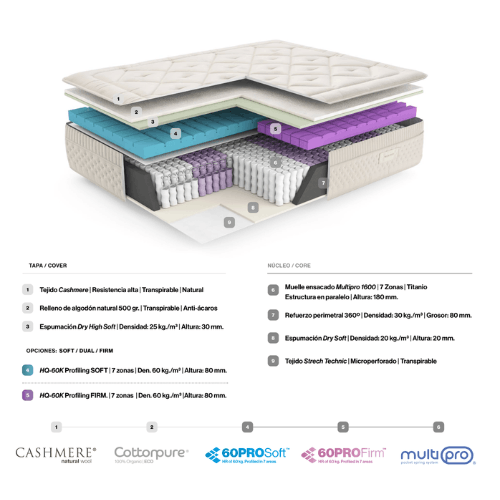 No seu núcleo destaca-se o sistema de 1600 molas ensacadas Multipro, distribuídas por 7 zonas de conforto diferenciadas, permitindo uma adaptação precisa às diferentes áreas do corpo. Esta estrutura oferece suporte ergonómico personalizado, excelente independência de movimentos e um descanso mais estável, sendo ideal para casais. O reforço estrutural com encapsulamento e reforço lateral aumenta a estabilidade do colchão, melhora o apoio nas extremidades e prolonga significativamente a sua vida útil.